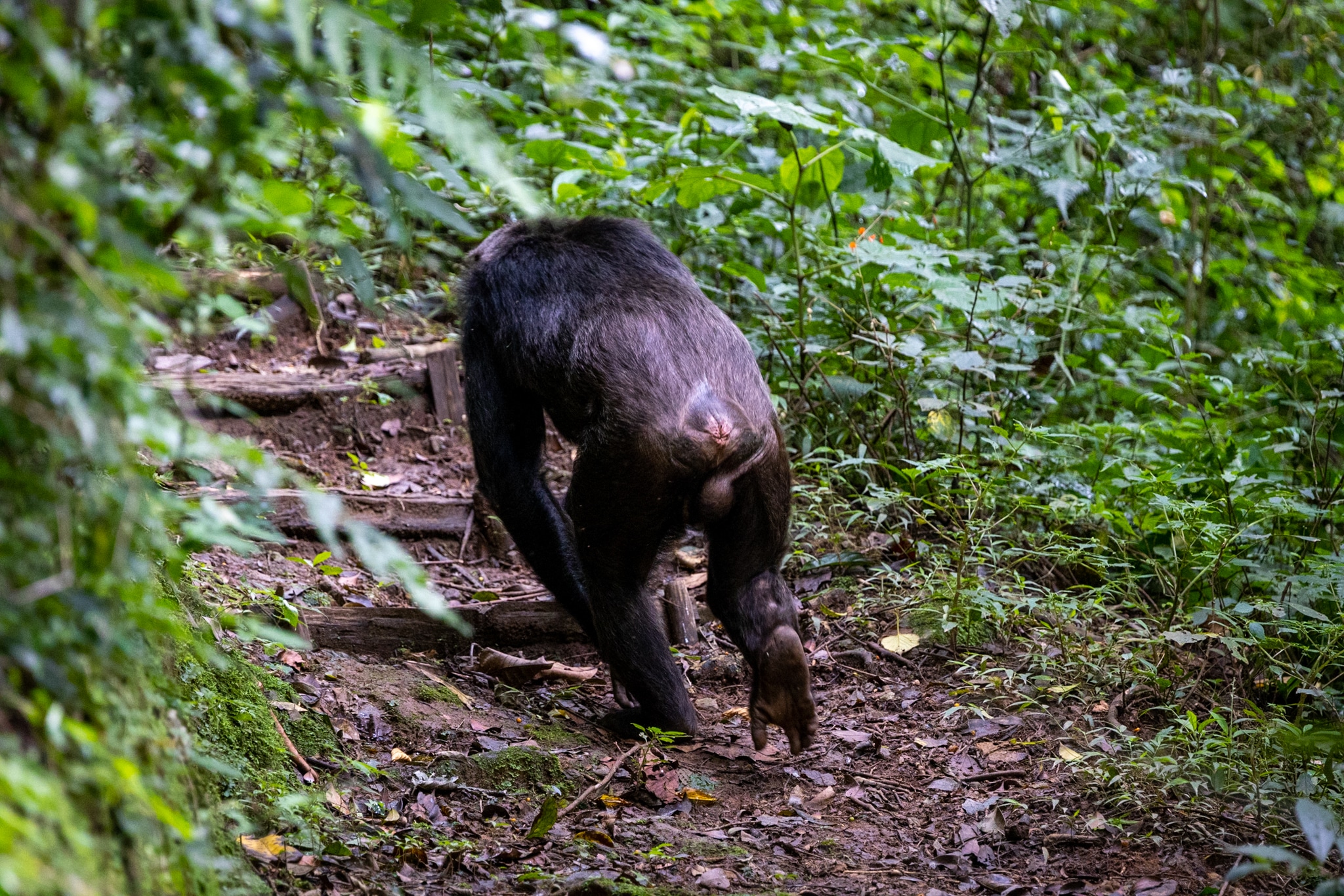 Three of us from our group separated into a “fast” group with hopes of quickly picking up the chimps’ trail. Unlike my previous experience with gorillas, these primates move and they move fast. We bolted through the jungle at a ferocious pace. Slashing vines and struggling not to fall from the steep slopes covered in decomposing wet leaves. After about 20 minutes of getting our asses kicked by the jungle, we finally arrived to meet a small group. Unfortunately, they wanted nothing to do with us, and they disappeared down a valley, covering a mile within just a few minutes. I was astounded just how quickly they could move through the forest. We were struggling so badly, and they made it look effortless. Not to worry, we caught up with them eventually.